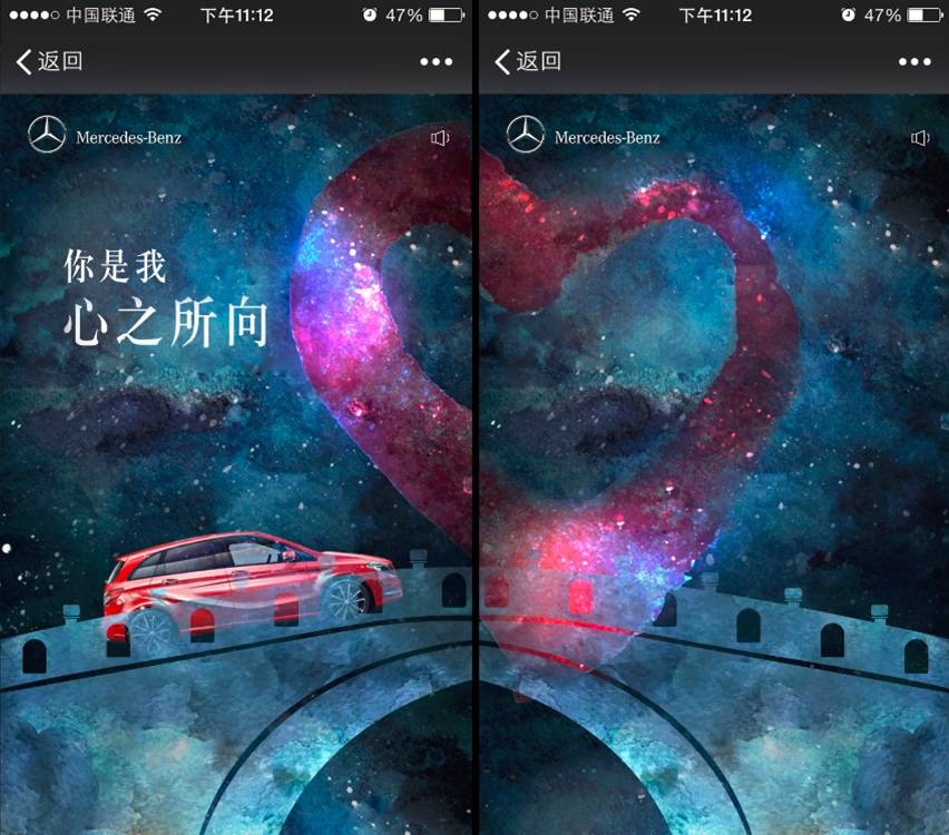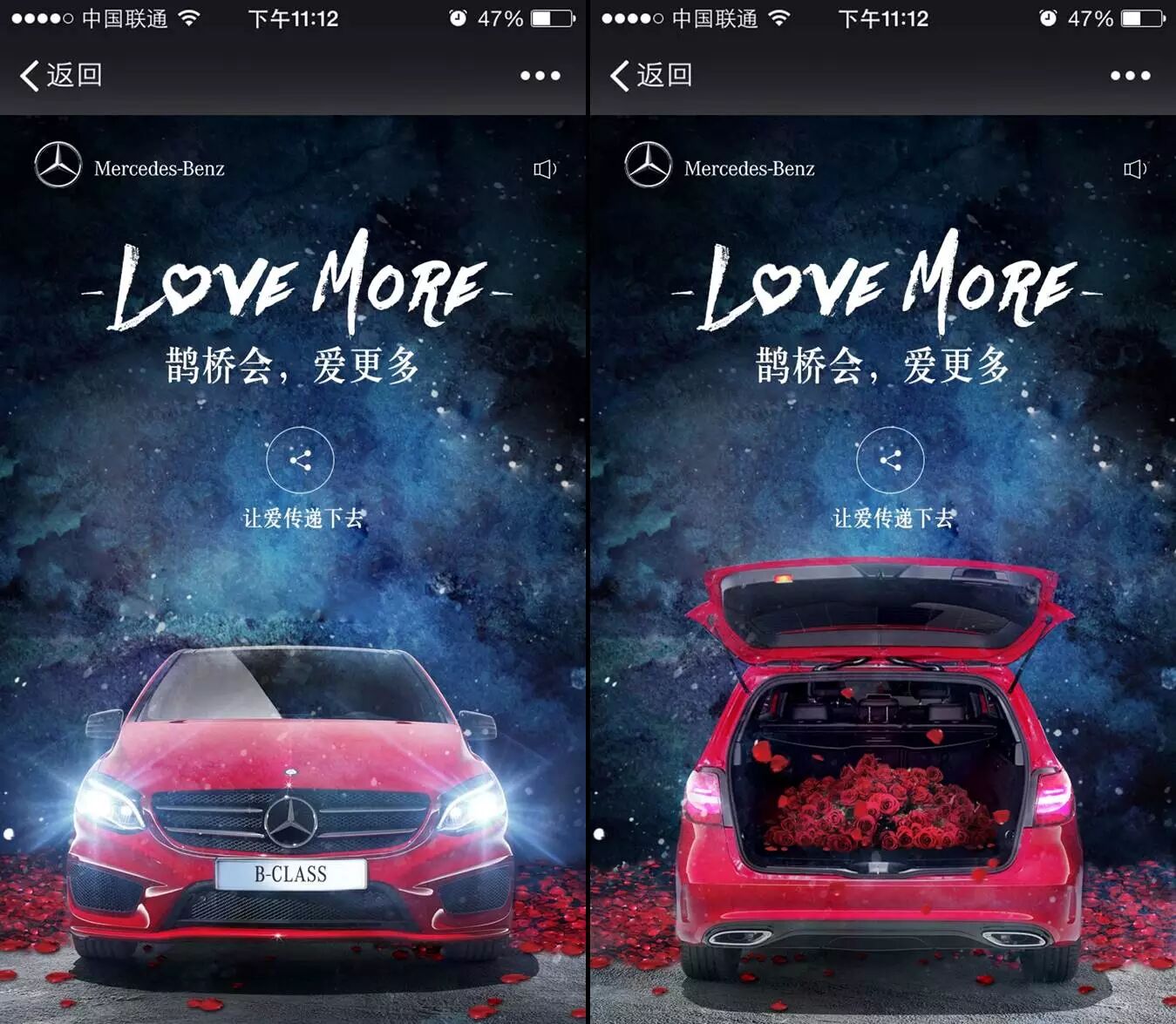 摇一摇你的手机进入下一页,梅赛德斯-奔驰B级运动旅行车将从你的手机驶到Ta的手机,带来七夕爱的惊喜。