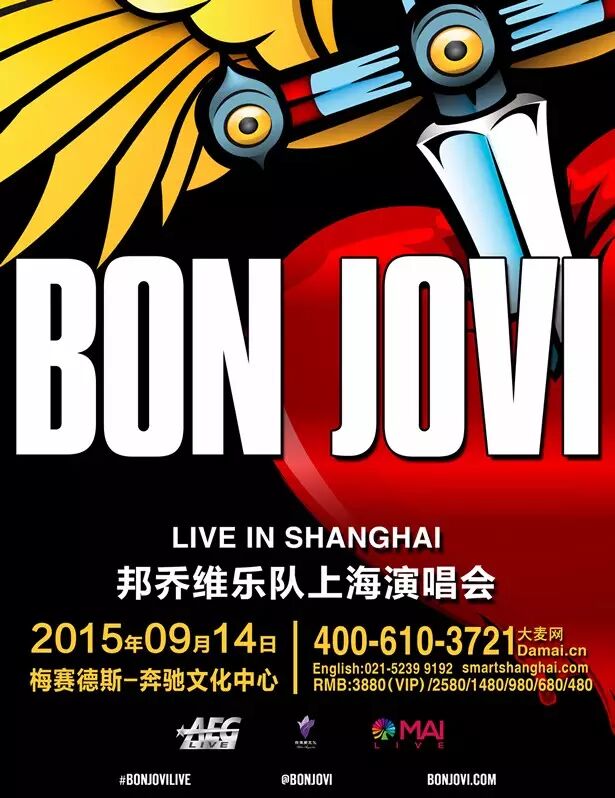Bon Jovi ——一支来自新泽西的传奇乐队,用30年的艺术生涯,诠释了如何将地下摇滚升格为主流金属!世界摇滚传奇Bon Jovi将于2015年9月14日强势登陆上海梅赛德斯-奔驰文化中心,带来他们的中国内地首秀。