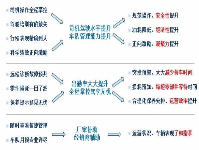 除了GPS采集的位置、速度等常规信息,FleetBoard®通过车身CAN总线接口读取车身数据,向FleetBoard®服务中心和用户终端反馈更多对运营有价值的信息,其中包括油耗、运行路线、路况、车辆磨损状态等。