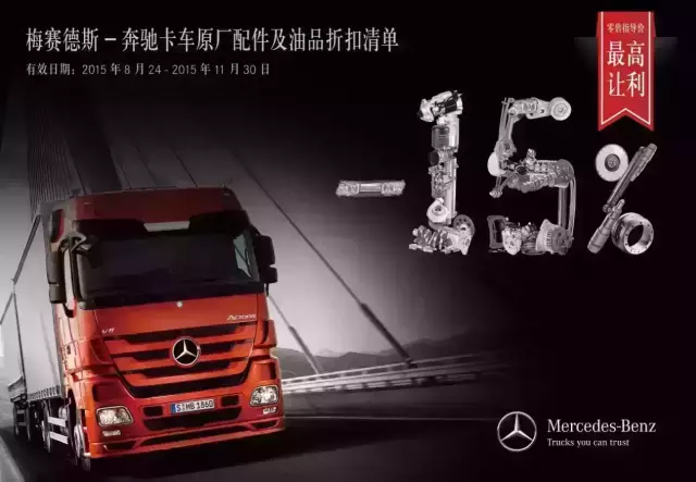 当前正是物流运输的高峰季,为保证并提高车辆安全性,助您应对来自不同路况的挑战,安心畅行,奔驰卡车中国特此奉上秋季原厂配件及油品优惠促销活动,以期回馈客户。