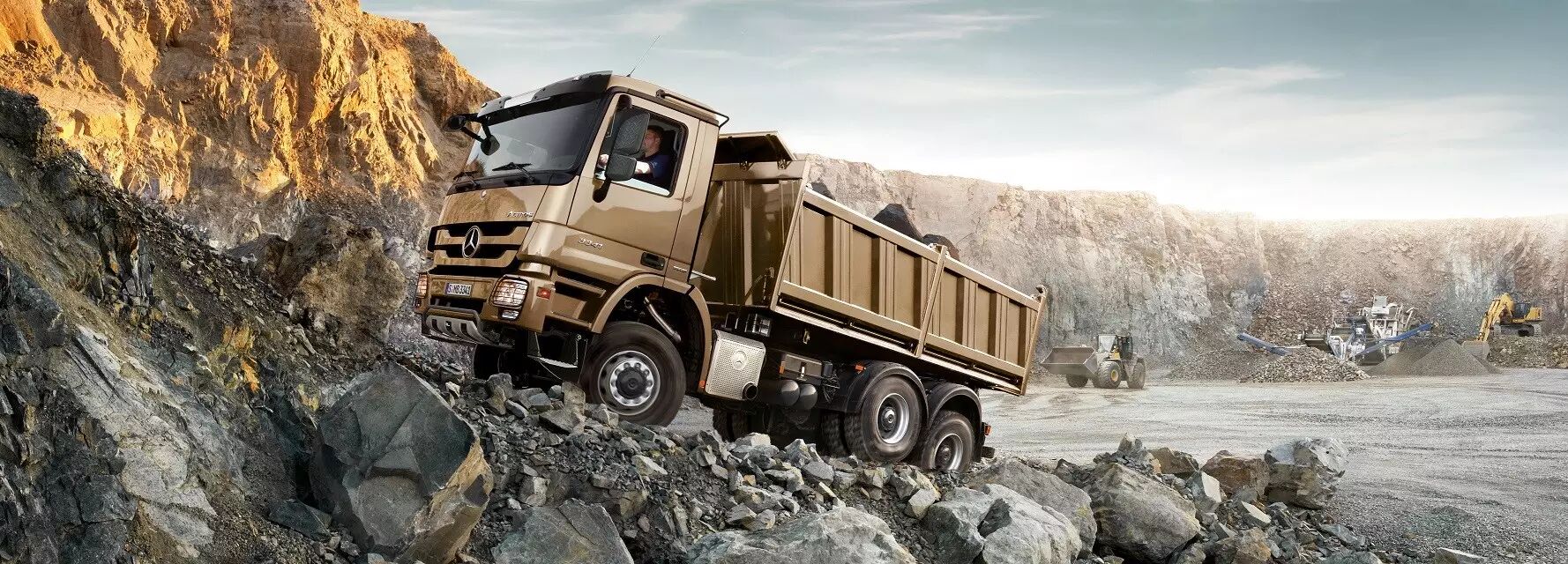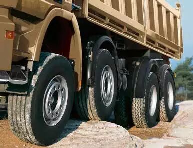 奔驰卡车通过车身设计和相应的技术令其工程车底盘满足上述要求,比如提高底盘高度以增大离地间隙和接近角;采用轮边减速桥以减小驱动桥主减速器尺寸,提高离地间隙同时半轴承载能力;使用抛物线钢板弹簧并对前后悬系统加强,一方面用于提高承载能力,另一方面可以增强车辆行驶的稳定性。驱动形式方面,奔驰卡车提供6×4、8×4底盘车型,更苛刻环境下,用户还可以选择6×6、8×6、8×8等。