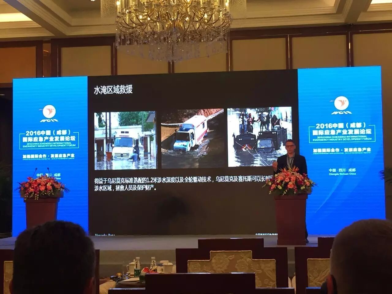 11月3日,在西博会之际,也同期召开了2016中国(成都)国际应急产业发展论坛,论坛主题为“加强国际合作·发展应急产业”。在论坛上,戴姆勒卡客车(中国)有限公司高级经理克里斯蒂安·维泽尔受邀就“乌尼莫克在应急救援行业的运用”进行演讲。