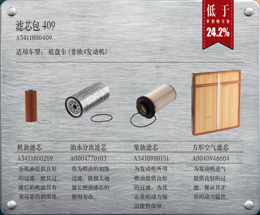 2017年4月21日起至5月31日,针对底盘车用户的梅赛德斯-奔驰卡车售后滤芯包409(机油滤芯、油水分离滤芯、柴油滤芯和方形空气滤芯)整装销售。与购买单个配件相比,组合包价格优惠24.2%。