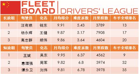 在长途运输组中,月度(5月)前三甲的车手分别是:汪有粮、杨永辉、高志群,驾驶得分分别为9.91、9.87、9.86。而且,难度系数非常高哟!