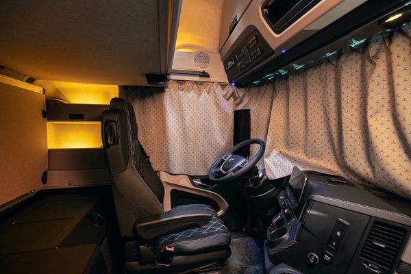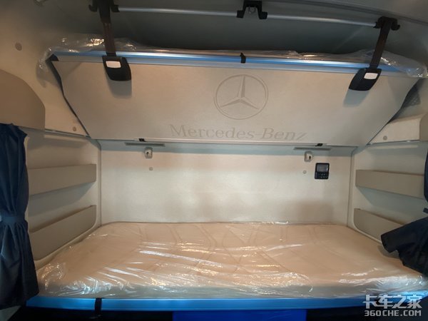 另外给我留下印象比较深的就是驾驶室的上卧铺,我们常见的上卧铺在驾驶室两侧都有一个支架,上卧铺放下来以后直接可以靠在支架上。但是奔驰的上卧铺没有,只有两根类似于安全带一样的绳子,绳子直接和驾驶室顶部连接。