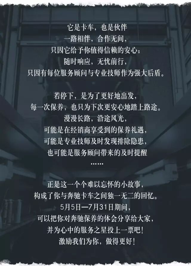 不管是贴心瞬间,还是动人经历,只要是与奔驰卡车保养相关,便可以参与分享活动,更有机会赢取好礼! 【投稿形式】 1. 文字形式:不少于200字的奔驰卡车保养故事;诗歌…
